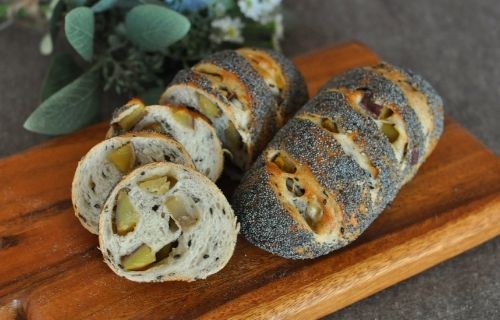 ごまを練りこんだ生地にさつまいもの甘煮をたっぷり巻き込みます。表面にはけしの実をたっぷりまぶします。