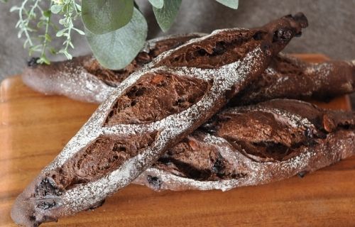 大麦粉とココアのパン生地にチョコレートを練りこんだソフトバゲットです。