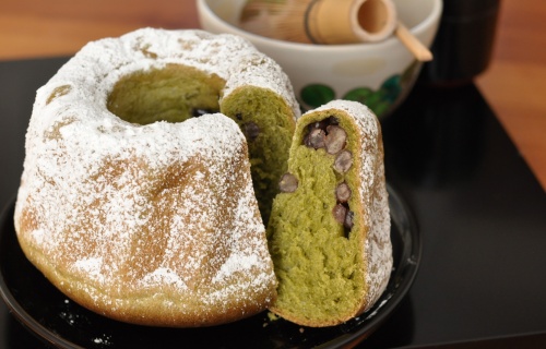 抹茶生地に大納言甘納豆とホワイトチョコレートを巻き込んだ和風クグロフです。クグロフ型をお持ちでしたら、このクグロフもぜひレパートリーに加えてくださいね。